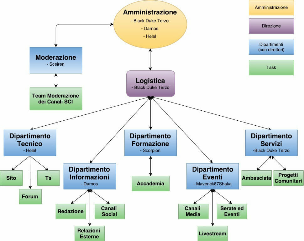 Qui di seguito trovate l’organigramma attuale di Star Citizen Italia, con riportati i nomi dei responsabili dei vari Dipartimenti.