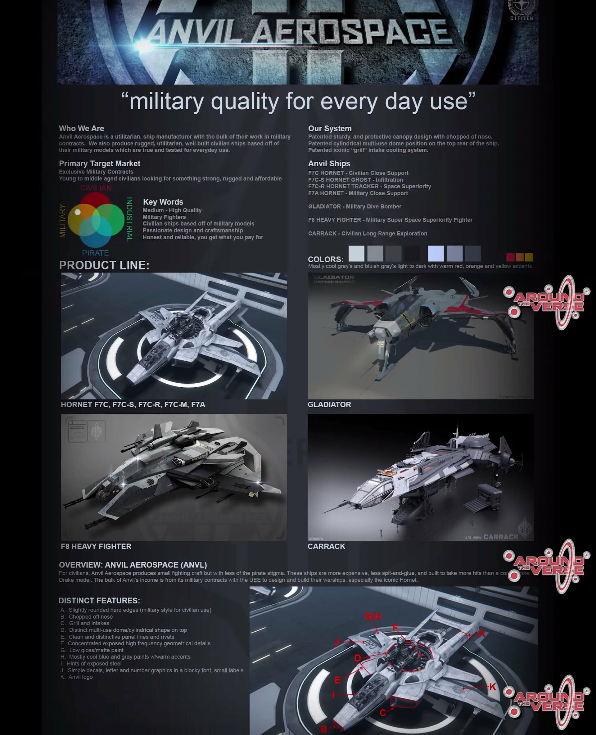 – La prima pagina contiene le informazioni sul marketing, il logo, le citazioni, le battute di contorno, la loro posizione all’interno dello ‘spettro’ delle navi dell’universo di Star Citizen (realizzano navi dal carattere più militare). Inoltre, ci sono informazioni sulla palette dei colori e su alcuni dei prodotti che hanno creato.