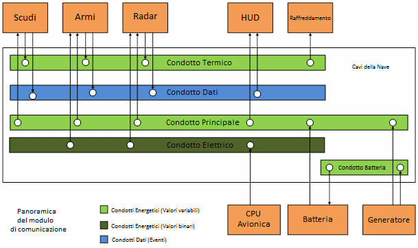 Ok, ok, è tutto fantastico, ma come fanno i vari componenti a funzionare insieme? Ciò è possibile grazie a dei “condotti” che connettono tutti i sistemi. Il condotto elettrico fornisce ad ogni dispositivo l’energia necessaria, mentre il condotto dati trasmette le informazioni tra i componenti. Ad esempio, il generatore degli scudi spedisce le sue informazioni attraverso il condotto dati, cosicché il livello degli scudi possa essere visionato nell’HUD. Ma attenzione, perché le connessioni potrebbero interrompersi, cosa che potrebbe avere diverse ripercussioni! Vogliamo che anche all’interno della vostra nave, e non solo nell’immensità dell’universo, trovino spazio nuove tipologie di gameplay, e un sistema di componenti totalmente interconnesso ci permetterà di raggiungere questo scopo.