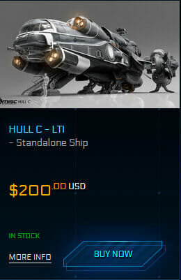 “Conoscete già la Hull C: parlando in termini statistici, ne avrete appena superata una sulla via verso la concessionaria. E’ la prima nave mercantile personalizzabile da media distanza della flotta di qualsiasi compagnia. La Hull C può essere il punto di partenza per una piccola attività commerciale, il cavallo da tiro di una mega-corporazione o qualsiasi cosa intermedia tra le due. Più una piattaforma che una nave, la Hull C può essere equipaggiata come mercantile tradizionale, trasporto corazzato da combattimento o persino come piattaforma Discreet altamente protetta. La Hull C conserva parte della velocità e della manovrabilità della A e della B, trasportando con se le comodità della Hull D ed E (come un intero quartiere abitativo e l’interfaccia medica).”