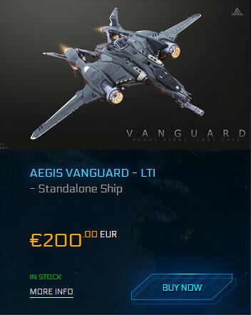 Per la prima volta, abbiamo inserito la Vanguard nello store per una vendita limitata e preliminare. Questo vuol dire che il progetto della nave soddisfa i nostri requisiti di qualità, ma non è ancora pronta per comparire nel vostro Hangar o per combattere nell’Arena Commander. Questa vendita include l’Assicurazione a Vita sullo scafo della nave ed un paio di oggetti decorativi per il vostro Hangar. In uno dei prossimi aggiornamenti inseriremo un poster della Vanguard, ed una volta che il modello in-game sarà pronto vi verrà dato anche un modellino della nave! In futuro, il prezzo della Vanguard aumenterà e l’offerta non includerà più l’Assicurazione a Vita o questi extra.