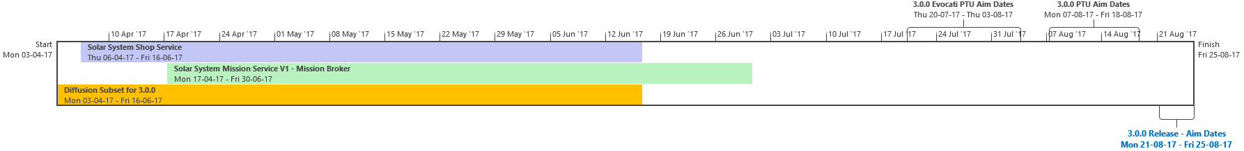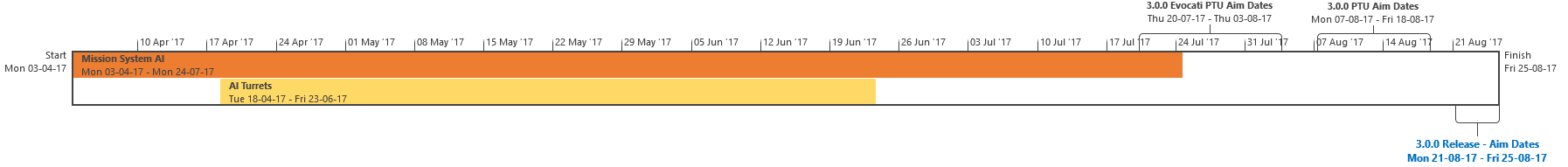 I compiti sono o funzionalità complete, o elementi il cui completamento ha un ETA. Alcune mansioni potrebbero richiedere ulteriore lavoro di QA, correzione dei bug e iterazioni. Compiti il cui completamento viene ritardato oltre le nostre date obiettivo potrebbero causare il ritardo del rilascio della 3.0.0, oppure potrebbero essere esclusi dalla 3.0.0, se ritenuto appropriato, per rispettare la data obiettivo di rilascio. Il lavoro della 3.0.0 è diviso in Sottosezioni: Contenuti Universo Persistente, FPS / Gameplay Spaziale, Ingegneristico, UI, IA, Grafica, Backend, Network, Navi & Armi.