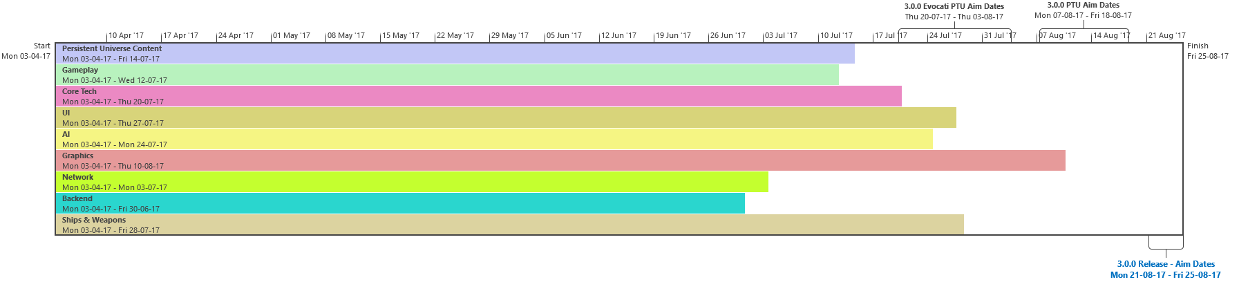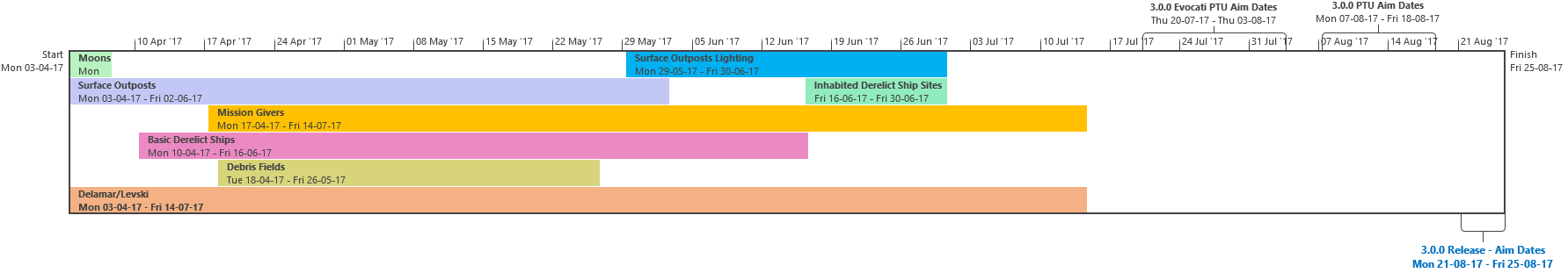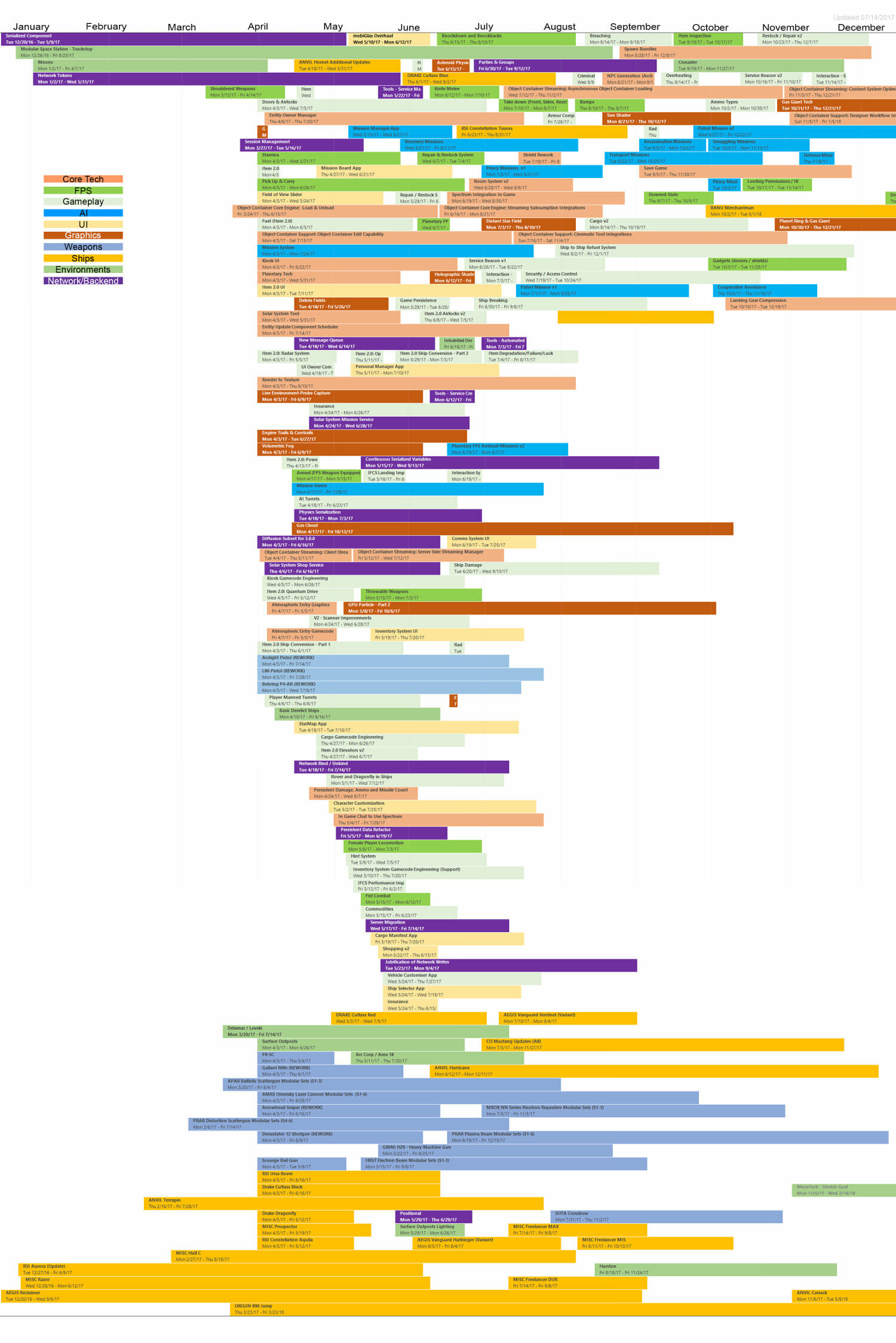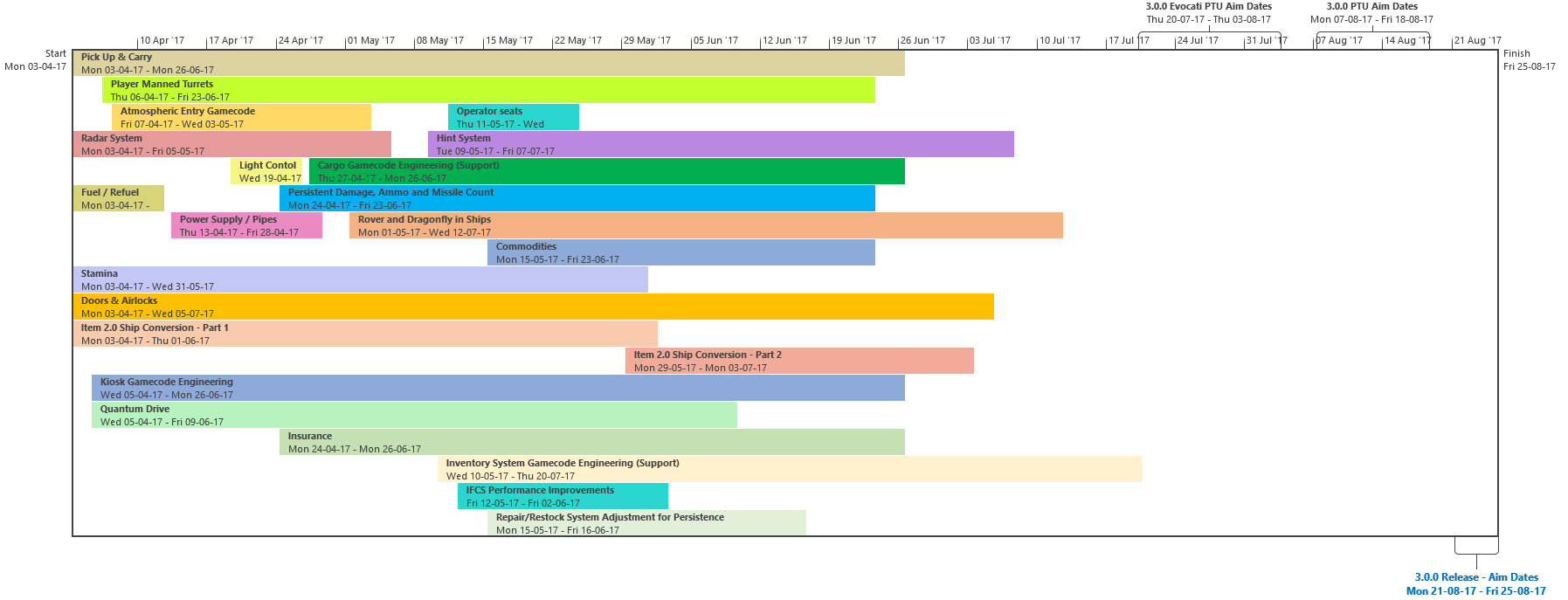 Di seguito troverete l’ultima roadmap dello sviluppo dell’Universo Persistente di Star Citizen. Sebbene il grosso di questa programmazione indichi i nostri compiti e le stime correlate agli elementi che potrete aspettarvi di trovare nell’imminente aggiornamento 3.0.0 (oltre che alcune delle mansioni che abbiamo già completato), stiamo anche includendo le proiezioni per la parte rimanente dell’anno, così che possiate vedere parte alcune delle funzionalità ed i contenuti in arrivo per l’Universo Persistente. Questa è la stessa identica programmazione che aggiorniamo quotidianamente e che circola all’interno dei nostri studi, seppure con qualche eccezione: i nomi dei singoli sviluppatori assegnati ai vari compiti saranno omessi (per ovvie ragioni), rimuoveremo i dettagli di JIRA e modificheremo il gergo tecnico per renderlo più facilmente comprensibile ad un pubblico più ampio. Inoltre siete pregati di notare che questa programmazione non indica tutto quello su cui la CIG sta attualmente lavorando, bensì quelle funzionalità e quei contenuti che ci sentiamo di poter promettere al momento. Escludendo il lavoro riguardante Squadron 42, abbiamo un paio di progetti di ricerca che, una volta confermati, passeremo alla fase di produzione ed aggiungeremo a questa programmazione. In caso contrario, quando qualcosa cambierà, ritarderà o sarà completata, ve lo faremo sapere.