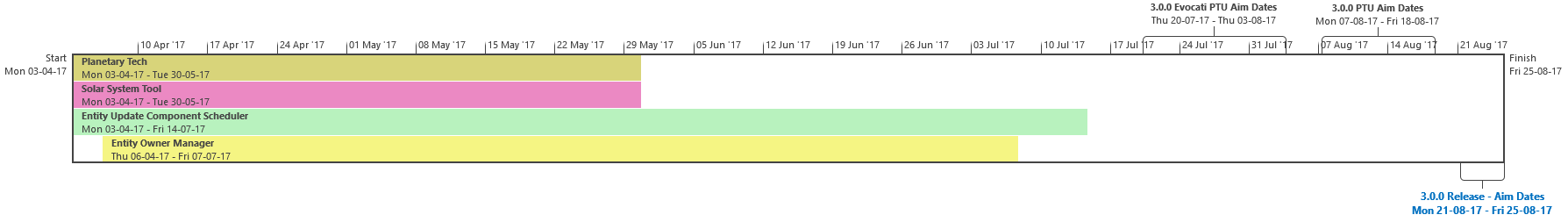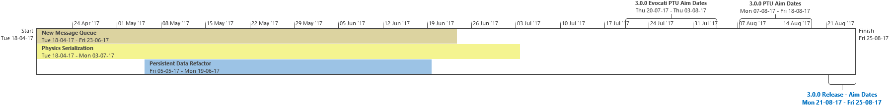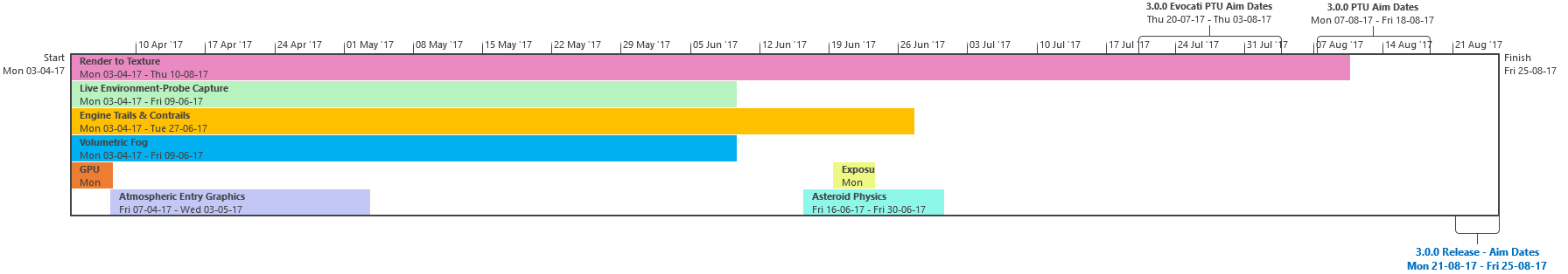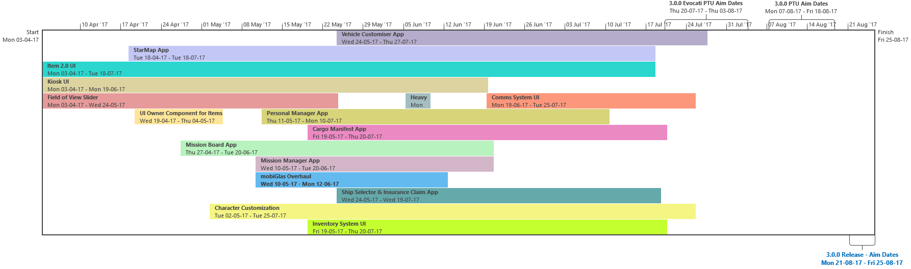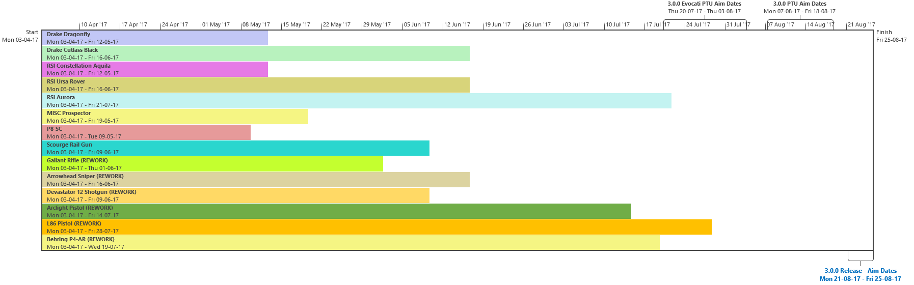 Di seguito troverete l’ultima roadmap dello sviluppo dell’Universo Persistente di Star Citizen. Sebbene il grosso di questa programmazione indichi i nostri compiti e le stime correlate agli elementi che potrete aspettarvi di trovare nell’imminente aggiornamento 3.0.0 (oltre che alcune delle mansioni che abbiamo già completato), stiamo anche includendo le proiezioni per la parte rimanente dell’anno, così che possiate vedere parte alcune delle funzionalità ed i contenuti in arrivo per l’Universo Persistente. Questa è la stessa identica programmazione che aggiorniamo quotidianamente e che circola all’interno dei nostri studi, seppure con qualche eccezione: i nomi dei singoli sviluppatori assegnati ai vari compiti saranno omessi (per ovvie ragioni), rimuoveremo i dettagli di JIRA e modificheremo il gergo tecnico per renderlo più facilmente comprensibile ad un pubblico più ampio. Inoltre siete pregati di notare che questa programmazione non indica tutto quello su cui la CIG sta attualmente lavorando, bensì quelle funzionalità e quei contenuti che ci sentiamo di poter promettere al momento. Escludendo il lavoro riguardante Squadron 42, abbiamo un paio di progetti di ricerca che, una volta confermati, passeremo alla fase di produzione ed aggiungeremo a questa programmazione. In caso contrario, quando qualcosa cambierà, ritarderà o sarà completata, ve lo faremo sapere.