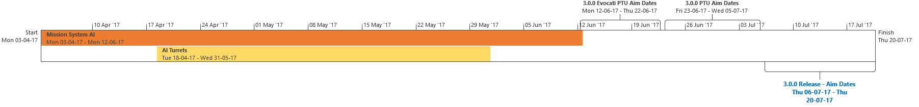 I compiti sono o funzionalità complete, o elementi il cui completamento ha un ETA. Alcune mansioni potrebbero richiedere ulteriore lavoro di QA, correzione dei bug e iterazioni. Compiti il cui completamento viene ritardato oltre le nostre date obiettivo potrebbero causare il ritardo del rilascio della 3.0.0, oppure potrebbero essere esclusi dalla 3.0.0, se ritenuto appropriato, per rispettare la data obiettivo di rilascio. Il lavoro della 3.0.0 è diviso in Sottosezioni: Contenuti Universo Persistente, FPS / Gameplay Spaziale, Ingegneristico, UI, IA, Grafica, Backend, Network, Navi & Armi.