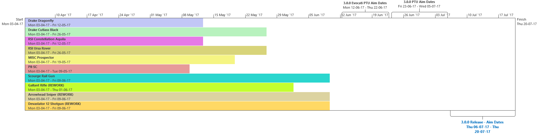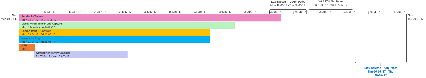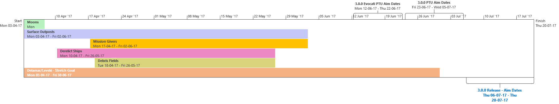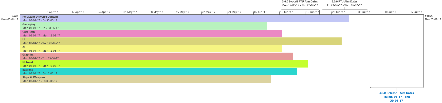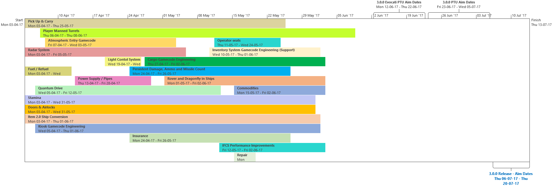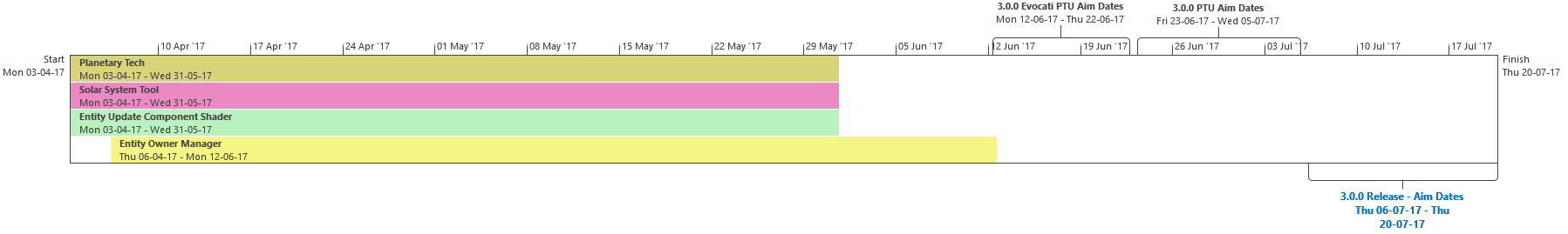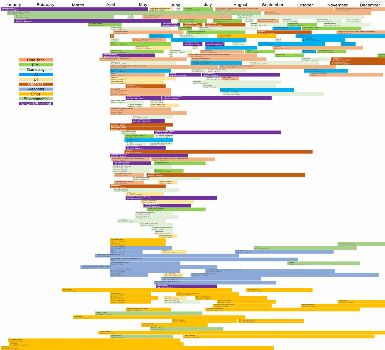 Di seguito troverete l’ultima roadmap dello sviluppo dell’Universo Persistente di Star Citizen. Sebbene il grosso di questa programmazione indichi i nostri compiti e le stime correlate agli elementi che potrete aspettarvi di trovare nell’imminente aggiornamento 3.0.0 (oltre che alcune delle mansioni che abbiamo già completato), stiamo anche includendo le proiezioni per la parte rimanente dell’anno, così che possiate vedere parte alcune delle funzionalità ed i contenuti in arrivo per l’Universo Persistente. Questa è la stessa identica programmazione che aggiorniamo quotidianamente e che circola all’interno dei nostri studi, seppure con qualche eccezione: i nomi dei singoli sviluppatori assegnati ai vari compiti saranno omessi (per ovvie ragioni), rimuoveremo i dettagli di JIRA e modificheremo il gergo tecnico per renderlo più facilmente comprensibile ad un pubblico più ampio. Inoltre siete pregati di notare che questa programmazione non indica tutto quello su cui la CIG sta attualmente lavorando, bensì quelle funzionalità e quei contenuti che ci sentiamo di poter promettere al momento. Escludendo il lavoro riguardante Squadron 42, abbiamo un paio di progetti di ricerca che, una volta confermati, passeremo alla fase di produzione ed aggiungeremo a questa programmazione. In caso contrario, quando qualcosa cambierà, ritarderà o sarà completata, ve lo faremo sapere.