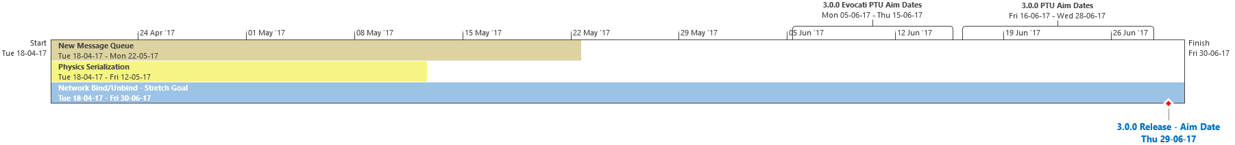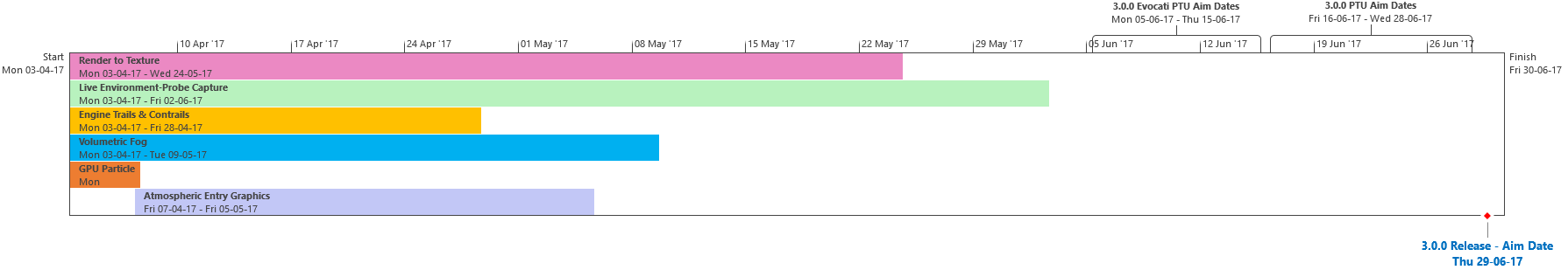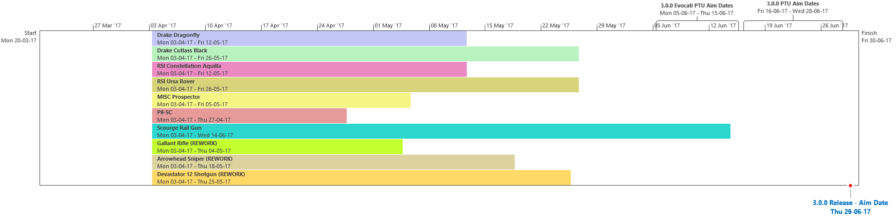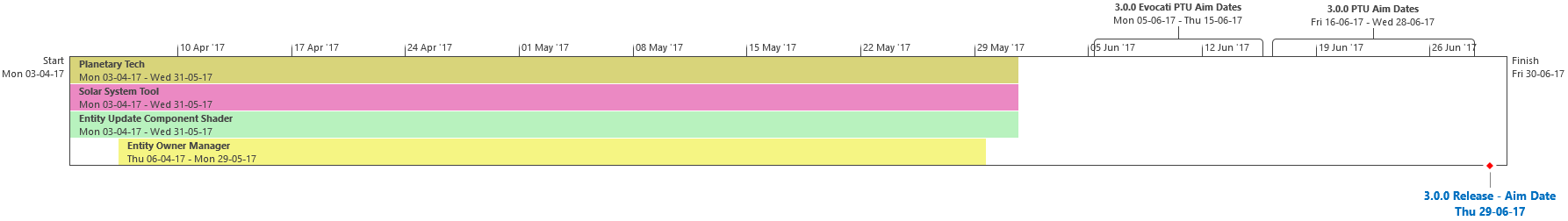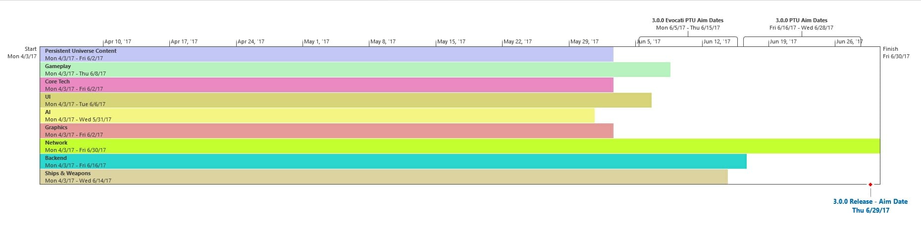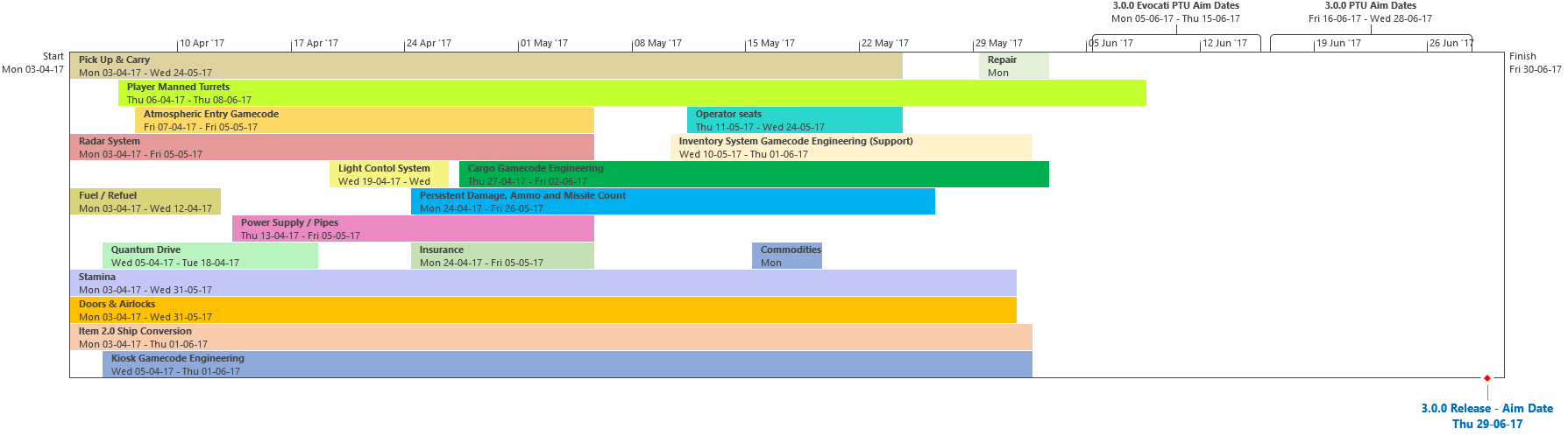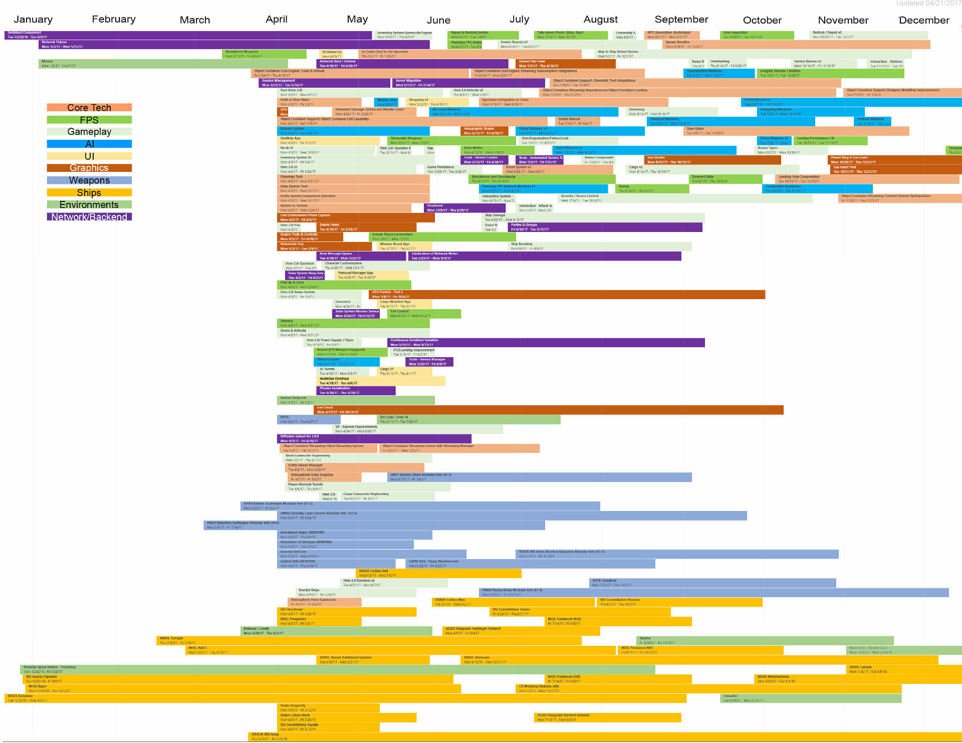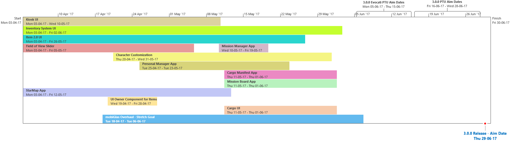 Di seguito troverete lultima roadmap dello sviluppo dellUniverso Persistente di Star Citizen. Sebbene il grosso di questa programmazione indichi i nostri compiti e le stime correlate agli elementi che potrete aspettarvi di trovare nellimminente aggiornamento 3.0.0 (oltre che alcune delle mansioni che abbiamo già completato), stiamo anche includendo le proiezioni per la parte rimanente dellanno, così che possiate vedere parte alcune delle funzionalità ed i contenuti in arrivo per lUniverso Persistente. Questa è la stessa identica programmazione che aggiorniamo quotidianamente e che circola allinterno dei nostri studi, seppure con qualche eccezione: i nomi dei singoli sviluppatori assegnati ai vari compiti saranno omessi (per ovvie ragioni), rimuoveremo i dettagli di JIRA e modificheremo il gergo tecnico per renderlo più facilmente comprensibile ad un pubblico più ampio. Inoltre siete pregati di notare che questa programmazione non indica tutto quello su cui la CIG sta attualmente lavorando, bensì quelle funzionalità e quei contenuti che ci sentiamo di poter promettere al momento. Escludendo il lavoro riguardante Squadron 42, abbiamo un paio di progetti di ricerca che, una volta confermati, passeremo alla fase di produzione ed aggiungeremo a questa programmazione. In caso contrario, quando qualcosa cambierà, ritarderà o sarà completata, ve lo faremo sapere.