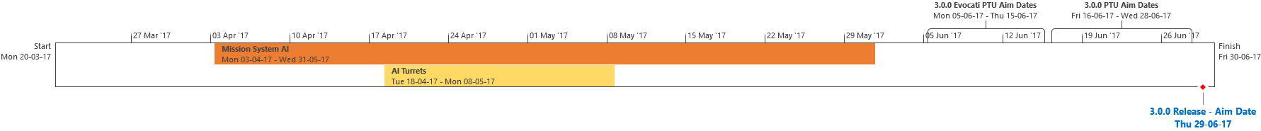 I compiti sono o funzionalità complete, o elementi il cui completamento ha un ETA. Alcune mansioni potrebbero richiedere ulteriore lavoro di QA, correzione dei bug e iterazioni. Compiti il cui completamento viene ritardato oltre le nostre date obiettivo potrebbero causare il ritardo del rilascio della 3.0.0, oppure potrebbero essere esclusi dalla 3.0.0, se ritenuto appropriato, per rispettare la data obiettivo di rilascio. Il lavoro della 3.0.0 è diviso in Sottosezioni: Contenuti Universo Persistente, FPS / Gameplay Spaziale, Ingegneristico, UI, IA, Grafica, Backend, Network, Navi & Armi.
