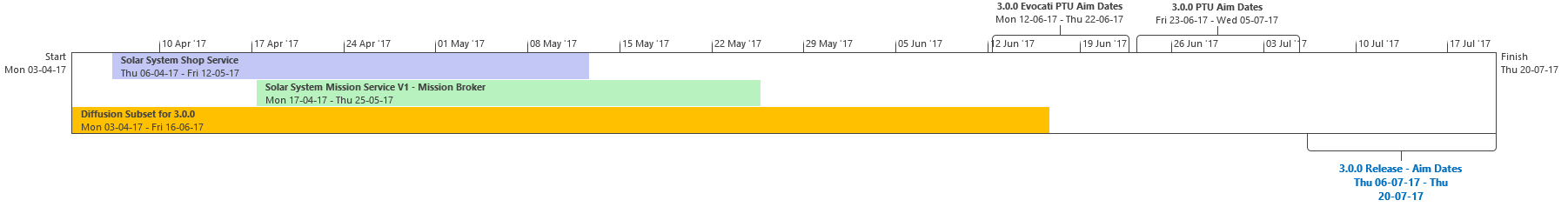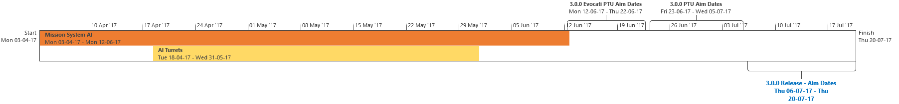 I compiti sono o funzionalità complete, o elementi il cui completamento ha un ETA. Alcune mansioni potrebbero richiedere ulteriore lavoro di QA, correzione dei bug e iterazioni. Compiti il cui completamento viene ritardato oltre le nostre date obiettivo potrebbero causare il ritardo del rilascio della 3.0.0, oppure potrebbero essere esclusi dalla 3.0.0, se ritenuto appropriato, per rispettare la data obiettivo di rilascio. Il lavoro della 3.0.0 è diviso in Sottosezioni: Contenuti Universo Persistente, FPS / Gameplay Spaziale, Ingegneristico, UI, IA, Grafica, Backend, Network, Navi & Armi.