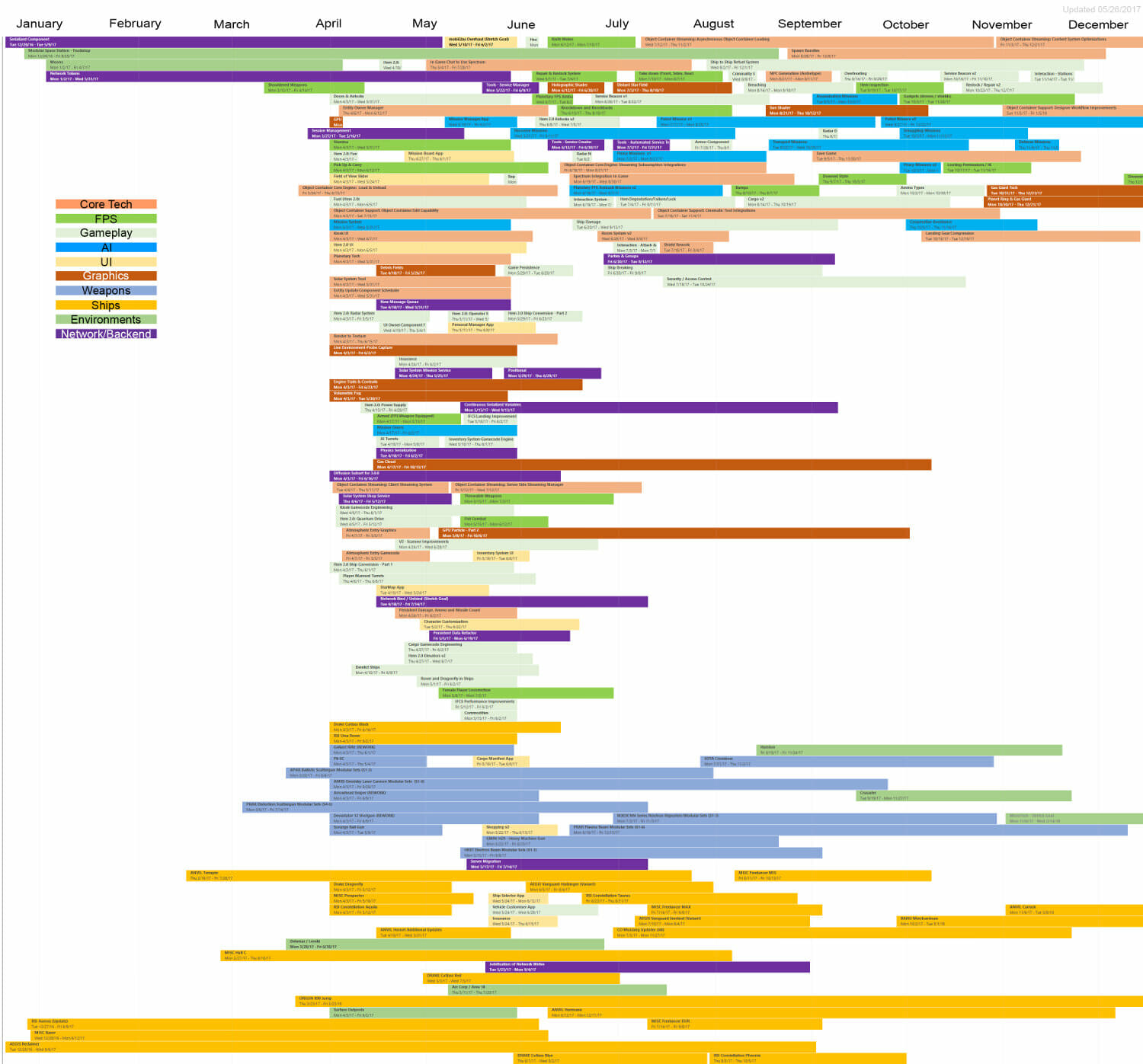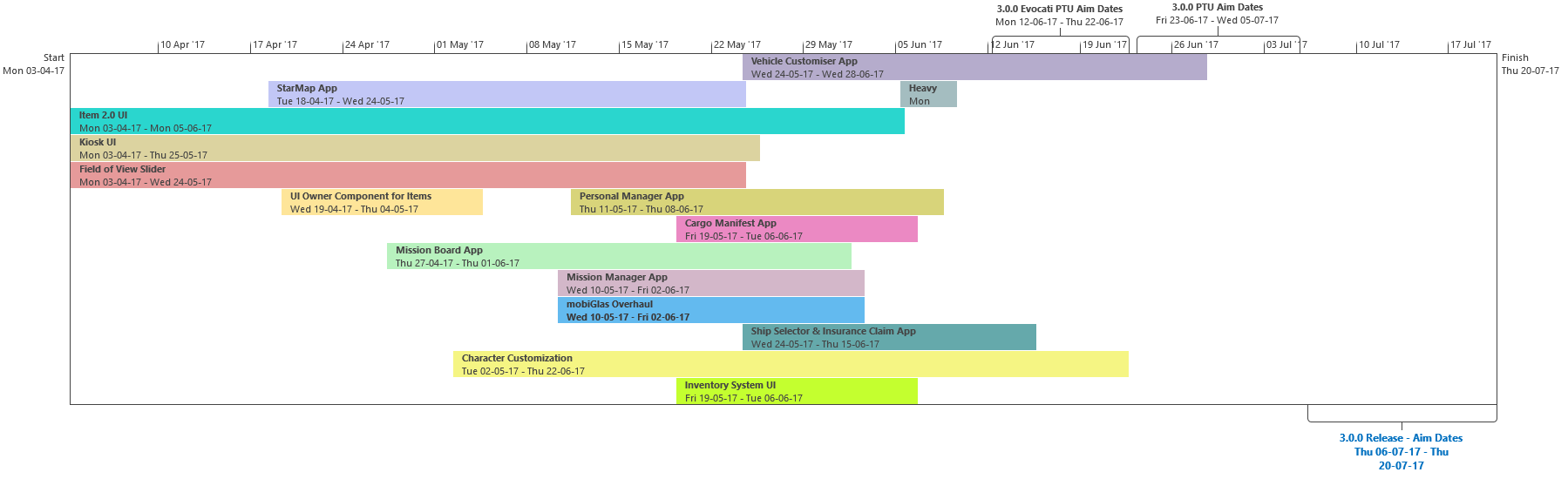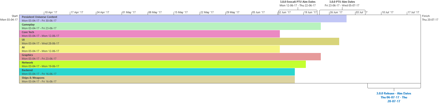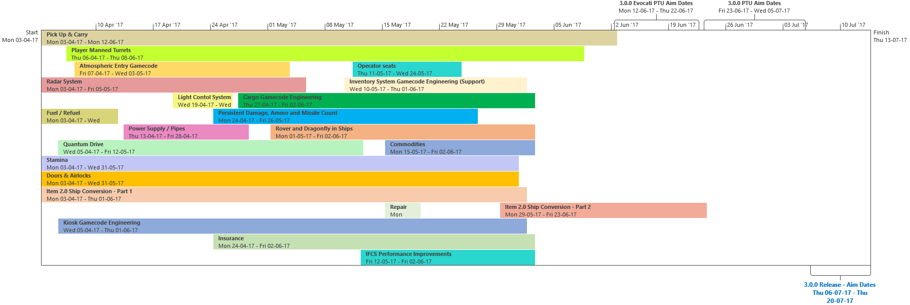 Di seguito troverete l’ultima roadmap dello sviluppo dell’Universo Persistente di Star Citizen. Sebbene il grosso di questa programmazione indichi i nostri compiti e le stime correlate agli elementi che potrete aspettarvi di trovare nell’imminente aggiornamento 3.0.0 (oltre che alcune delle mansioni che abbiamo già completato), stiamo anche includendo le proiezioni per la parte rimanente dell’anno, così che possiate vedere parte alcune delle funzionalità ed i contenuti in arrivo per l’Universo Persistente. Questa è la stessa identica programmazione che aggiorniamo quotidianamente e che circola all’interno dei nostri studi, seppure con qualche eccezione: i nomi dei singoli sviluppatori assegnati ai vari compiti saranno omessi (per ovvie ragioni), rimuoveremo i dettagli di JIRA e modificheremo il gergo tecnico per renderlo più facilmente comprensibile ad un pubblico più ampio. Inoltre siete pregati di notare che questa programmazione non indica tutto quello su cui la CIG sta attualmente lavorando, bensì quelle funzionalità e quei contenuti che ci sentiamo di poter promettere al momento. Escludendo il lavoro riguardante Squadron 42, abbiamo un paio di progetti di ricerca che, una volta confermati, passeremo alla fase di produzione ed aggiungeremo a questa programmazione. In caso contrario, quando qualcosa cambierà, ritarderà o sarà completata, ve lo faremo sapere.