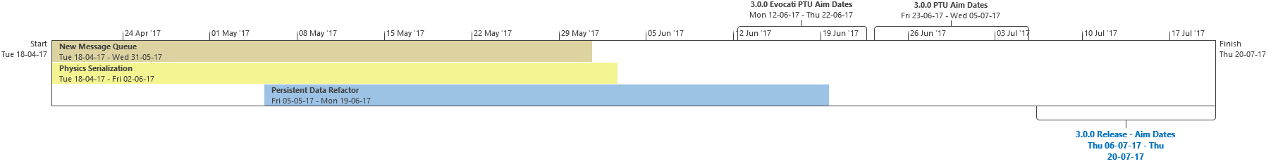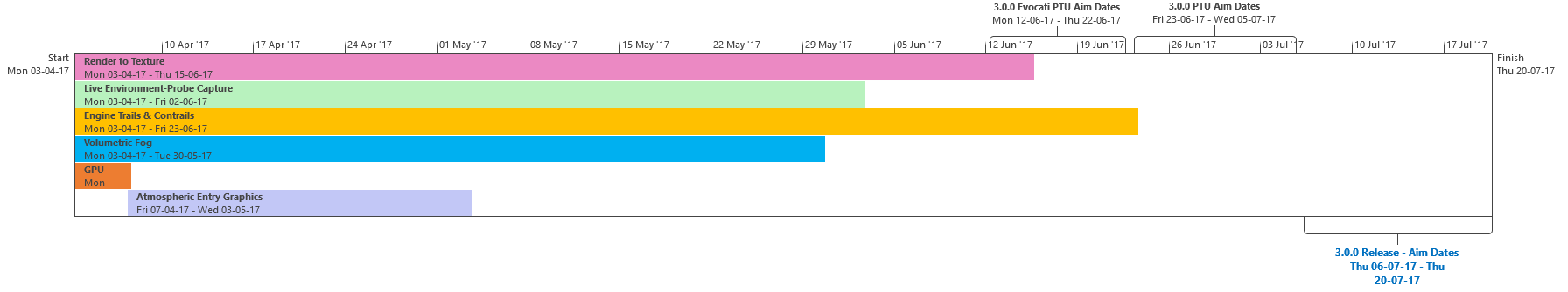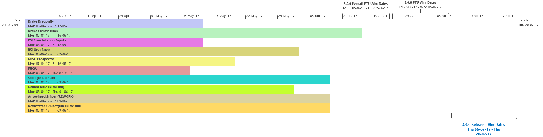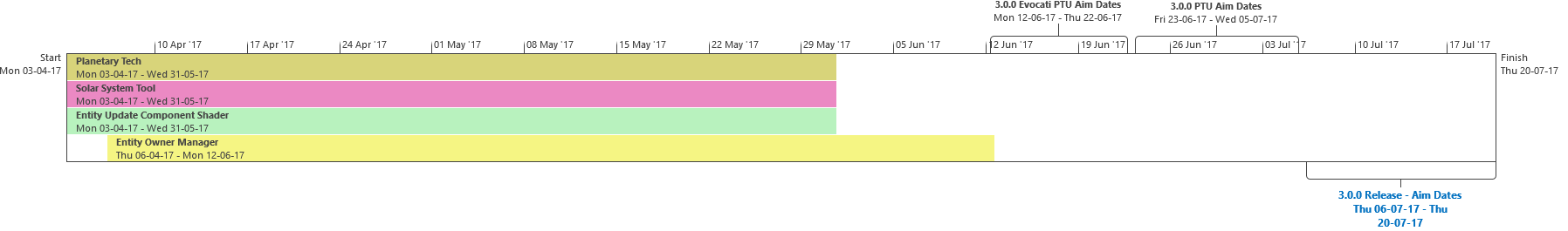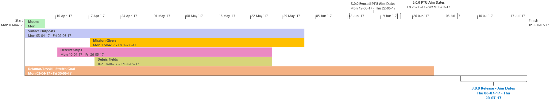 Di seguito troverete l’ultima roadmap dello sviluppo dell’Universo Persistente di Star Citizen. Sebbene il grosso di questa programmazione indichi i nostri compiti e le stime correlate agli elementi che potrete aspettarvi di trovare nell’imminente aggiornamento 3.0.0 (oltre che alcune delle mansioni che abbiamo già completato), stiamo anche includendo le proiezioni per la parte rimanente dell’anno, così che possiate vedere parte alcune delle funzionalità ed i contenuti in arrivo per l’Universo Persistente. Questa è la stessa identica programmazione che aggiorniamo quotidianamente e che circola all’interno dei nostri studi, seppure con qualche eccezione: i nomi dei singoli sviluppatori assegnati ai vari compiti saranno omessi (per ovvie ragioni), rimuoveremo i dettagli di JIRA e modificheremo il gergo tecnico per renderlo più facilmente comprensibile ad un pubblico più ampio. Inoltre siete pregati di notare che questa programmazione non indica tutto quello su cui la CIG sta attualmente lavorando, bensì quelle funzionalità e quei contenuti che ci sentiamo di poter promettere al momento. Escludendo il lavoro riguardante Squadron 42, abbiamo un paio di progetti di ricerca che, una volta confermati, passeremo alla fase di produzione ed aggiungeremo a questa programmazione. In caso contrario, quando qualcosa cambierà, ritarderà o sarà completata, ve lo faremo sapere.