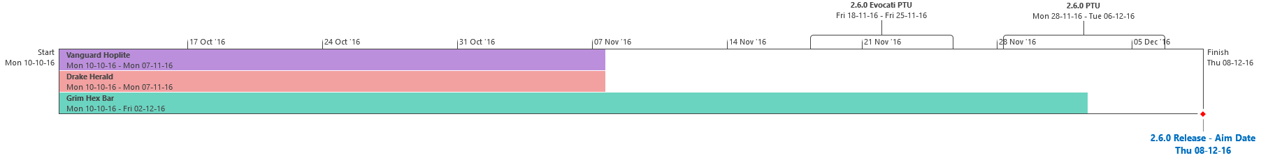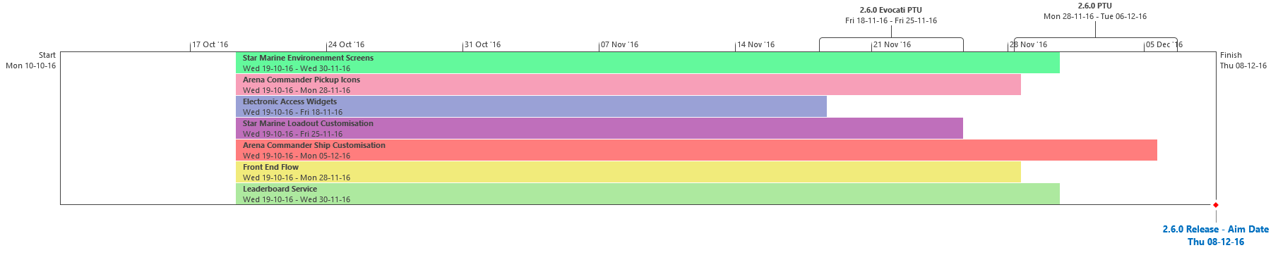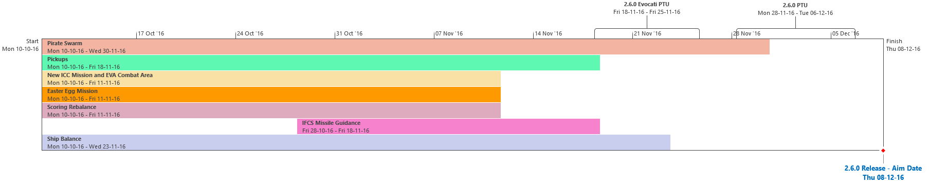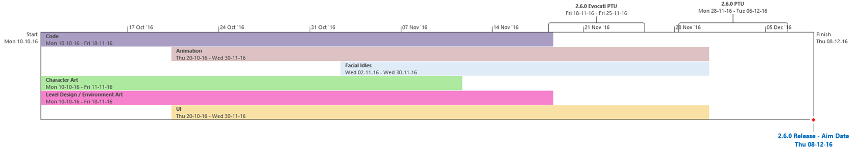 Di seguito troverai l’Attuale Programmazione dei Traguardi di sviluppo. Questa è la stessa identica programmazione che aggiorniamo quotidianamente e che circola all’interno dei nostri studi, seppure con qualche eccezione: i nomi dei singoli sviluppatori assegnati ai vari compiti saranno omessi (per ovvie ragioni), rimuoveremo i dettagli di JIRA e modificheremo il gergo tecnico per renderlo più facilmente comprensibile ad un pubblico più ampio, ma ad eccezione di questi punti, quando qualcosa cambierà, slitterà o sarà completata, voi ne sarete informati.