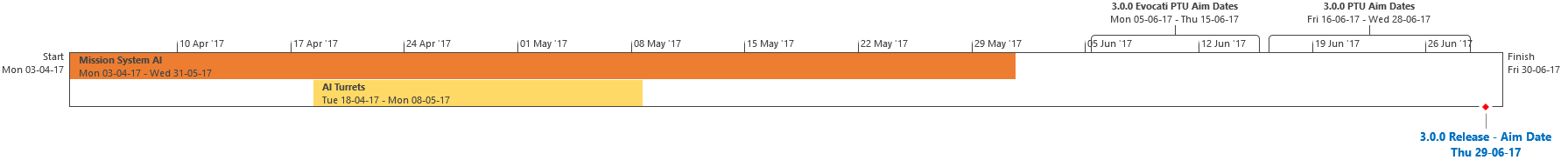 I compiti sono o funzionalità complete, o elementi il cui completamento ha un ETA. Alcune mansioni potrebbero richiedere ulteriore lavoro di QA, correzione dei bug e iterazioni. Compiti il cui completamento viene ritardato oltre le nostre date obiettivo potrebbero causare il ritardo del rilascio della 3.0.0, oppure potrebbero essere esclusi dalla 3.0.0, se ritenuto appropriato, per rispettare la data obiettivo di rilascio. Il lavoro della 3.0.0 è diviso in Sottosezioni: Contenuti Universo Persistente, FPS / Gameplay Spaziale, Ingegneristico, UI, IA, Grafica, Backend, Network, Navi & Armi.