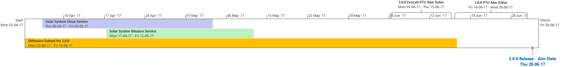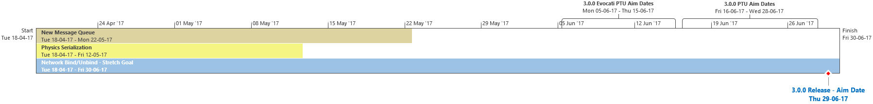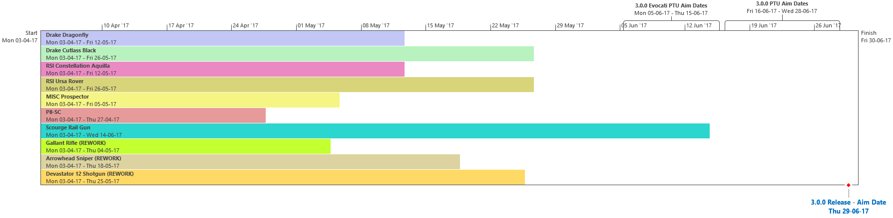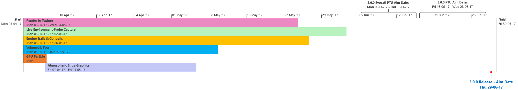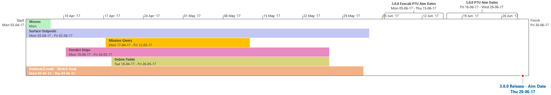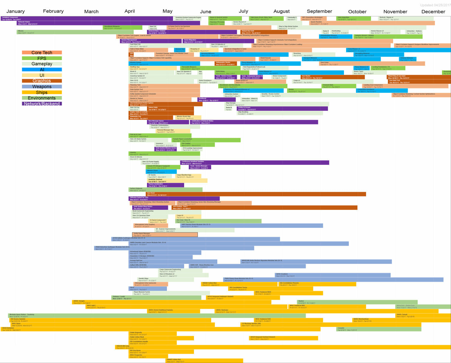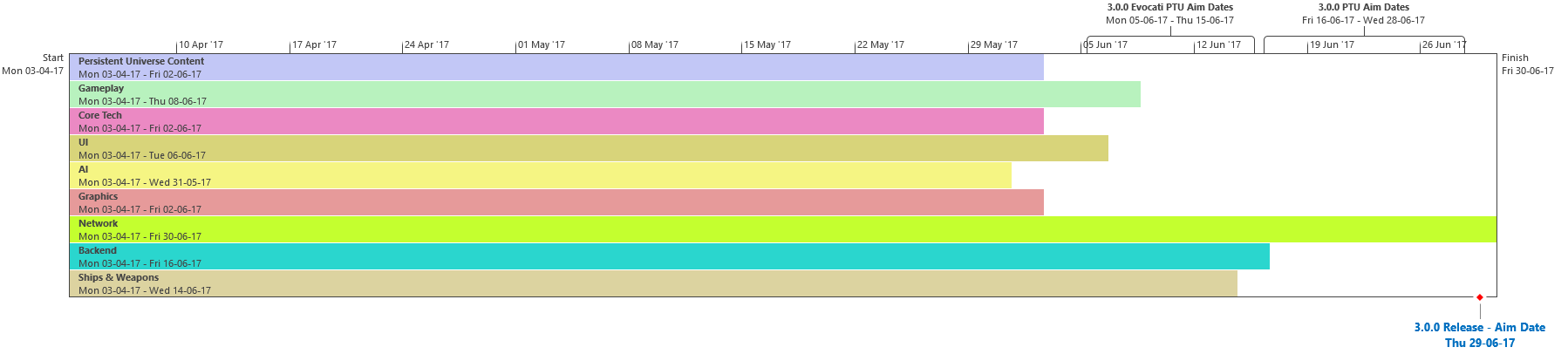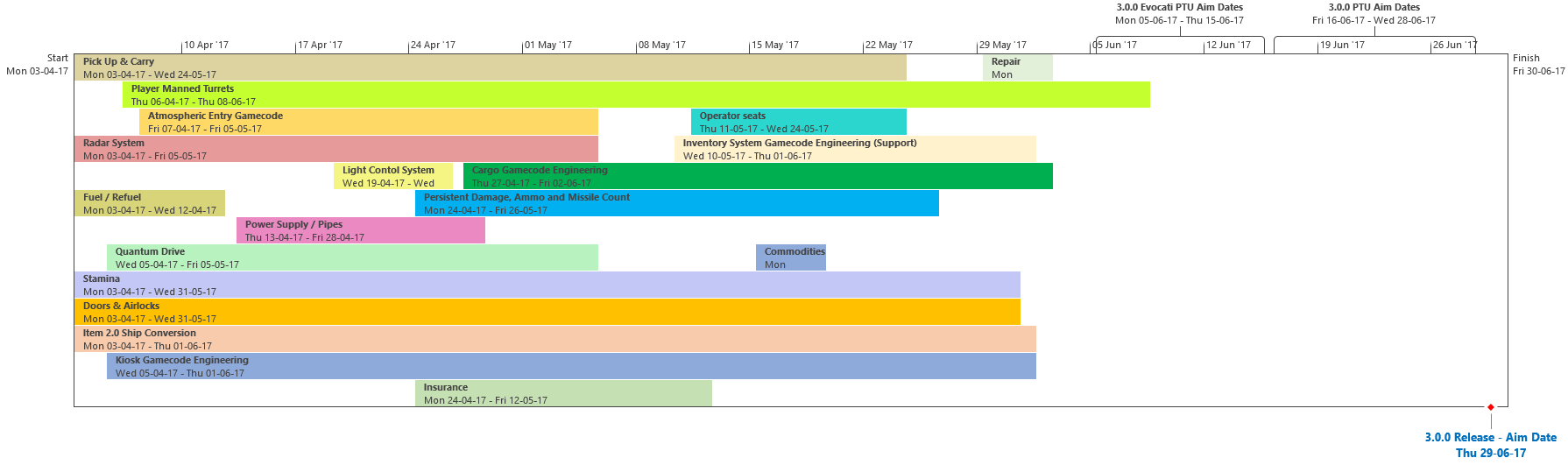 Di seguito troverete lultima roadmap dello sviluppo dellUniverso Persistente di Star Citizen. Sebbene il grosso di questa programmazione indichi i nostri compiti e le stime correlate agli elementi che potrete aspettarvi di trovare nellimminente aggiornamento 3.0.0 (oltre che alcune delle mansioni che abbiamo già completato), stiamo anche includendo le proiezioni per la parte rimanente dellanno, così che possiate vedere parte alcune delle funzionalità ed i contenuti in arrivo per lUniverso Persistente. Questa è la stessa identica programmazione che aggiorniamo quotidianamente e che circola allinterno dei nostri studi, seppure con qualche eccezione: i nomi dei singoli sviluppatori assegnati ai vari compiti saranno omessi (per ovvie ragioni), rimuoveremo i dettagli di JIRA e modificheremo il gergo tecnico per renderlo più facilmente comprensibile ad un pubblico più ampio. Inoltre siete pregati di notare che questa programmazione non indica tutto quello su cui la CIG sta attualmente lavorando, bensì quelle funzionalità e quei contenuti che ci sentiamo di poter promettere al momento. Escludendo il lavoro riguardante Squadron 42, abbiamo un paio di progetti di ricerca che, una volta confermati, passeremo alla fase di produzione ed aggiungeremo a questa programmazione. In caso contrario, quando qualcosa cambierà, ritarderà o sarà completata, ve lo faremo sapere.