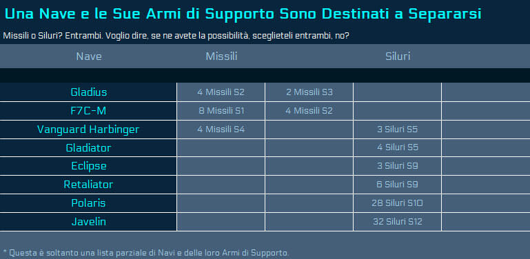 I punti di aggancio per le armi di supporto sono la nuova definizione di una tipologia di itemport presente in gioco già da qualche tempo, ma che in passato erano stati utilizzati esclusivamente per installarvi le rastrelliere missilistiche. Da oggi in poi potranno ospitare missili, razziere ed altri oggetti che faranno la loro comparsa in futuro e che saranno più adatti a questa tipologia di punti di aggancio. Dal momento che nella maggior parte dei casi finirete per utilizzare questi punti per l’installazione di armamenti primari come missili e siluri, vorremmo chiarire meglio le differenze (e somiglianze) tra questi due congegni bellici di supporto.