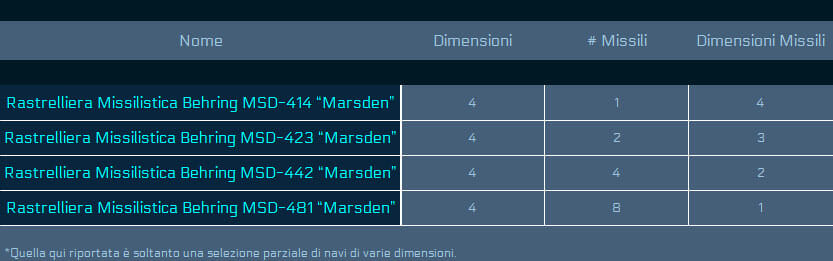 Per dare un’idea di come sia possibile calcolare la capacità di carico delle rastrelliere missilistiche in base alla loro taglia, diamo un’occhiata alla serie “Marsden” della Behring.