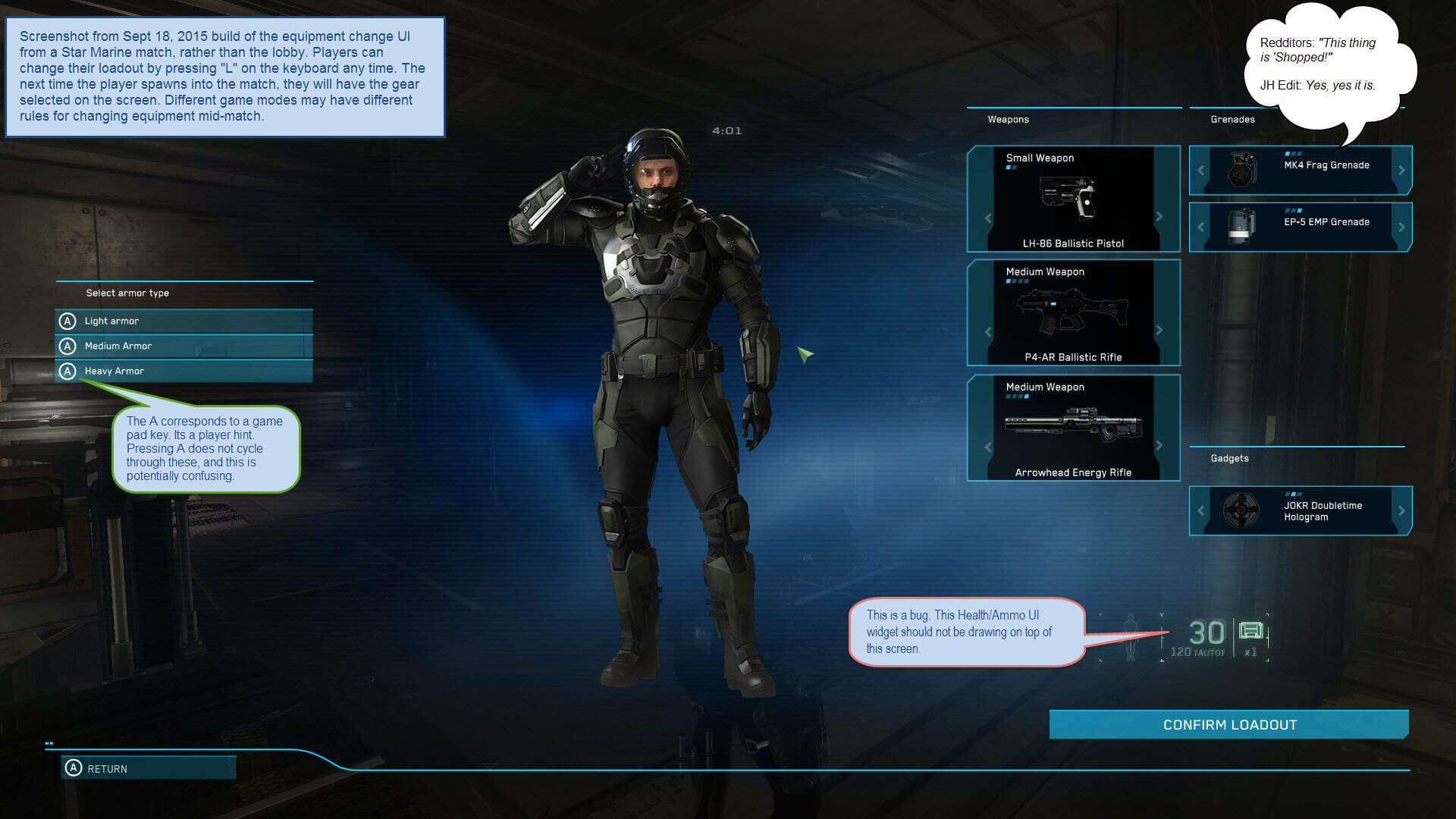 Negli screenshot allegati potete vedere le schermate della Lobby e di caricamento in-game che sono state implementate utilizzando le nuove immagini dei personaggi dei giocatori realizzate da HVR. I test di QA hanno mostrato l’esistenza di una serie di problemi minori, come risulta evidente anche dagli screenshot. Questi problemi non ci impediranno di rilasciare inizialmente Star Marine sui server PTU e potranno essere risolti in un secondo momento. Il team della UI ha inoltre inviato il codice per il widget di rilevamento delle collisioni. Il suggerimento della UI “Premere R per ricaricare” è pronto ed è stato inviato alla revisione del codice. Abbiamo inoltre risolto un problema con l’oggetto MedPack ed abbiamo modificato l’assegnazione dei tasti per curare gli altri così da richiedere di essere mantenuti premuti per effettuare l’azione correlata.